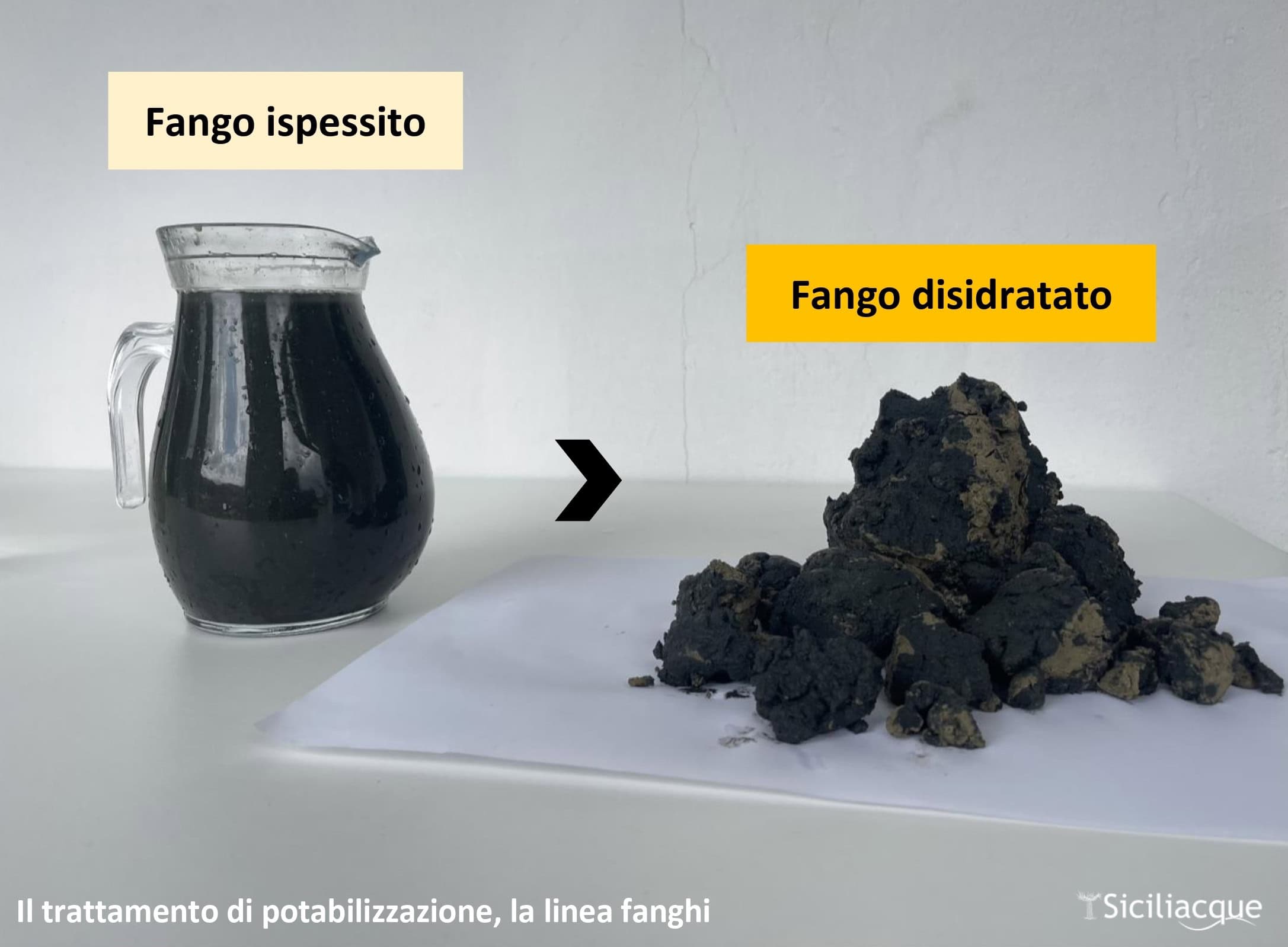 Il risultato è ben visibile anche a occhio nudo. Basta dare un’occhiata alle fotografie scattate prima e dopo il ciclo di trattamento dell’acqua per capire cosa entra e cosa esce da un potabilizzatore. Le peggiori caratteristiche possibili dell’acqua proveniente dalla diga Fanaco, che ne determinano comunque la possibilità di trattamento per diventare potabile, corrispondono a circa 500 milligrammi per ogni litro di acqua grezza, ovvero ad una percentuale di sostanza secca pari a circa lo 0,5 per mille. L’acqua buona, quella cioè con parametri entro i limiti di legge, viene destinata al consumo domestico; mentre il fango viene trattato fino a quando non è talmente disidratato da poter essere conferito in discarica o negli impianti di riutilizzo che lo trasformano in mattoni (laterizi usati in edilizia).