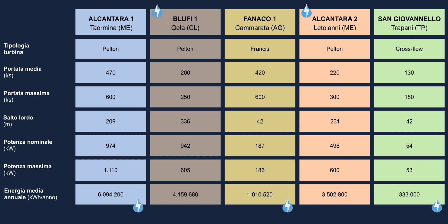 La stessa cosa accade nelle altre tre centrali idroelettriche: Blufi 1 (Gela), Fanaco 1 (Cammarata) e San Giovannello (Erice). L’impianto di Gela, con una turbina Pelton a due getti, può arrivare a una potenza massima di 605 Kilowatt e produce mediamente 4,1 milioni di kWh all’anno.